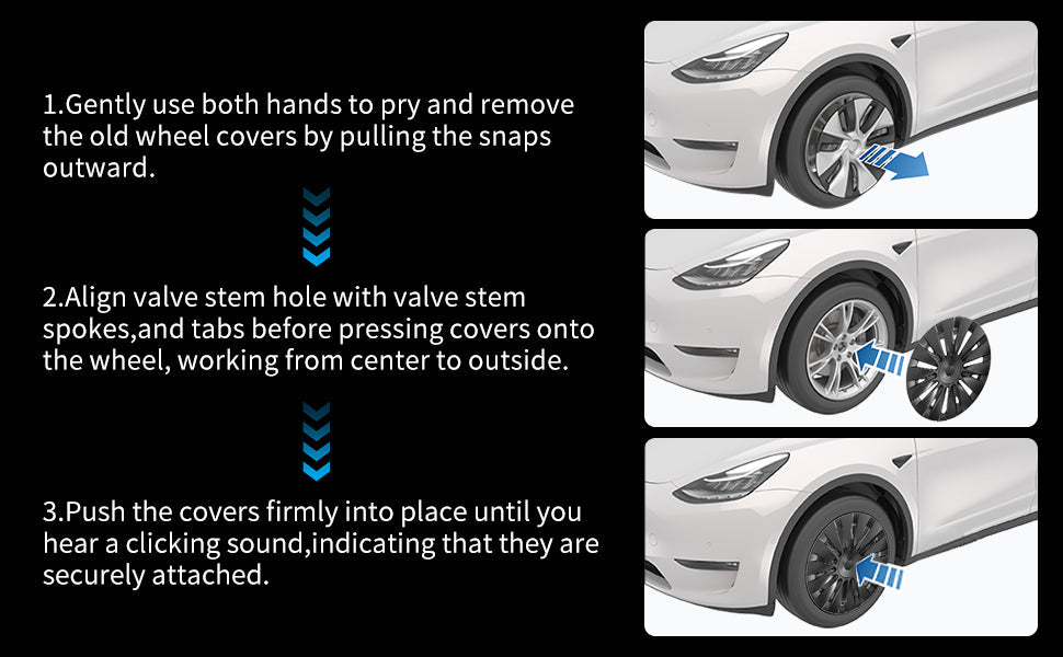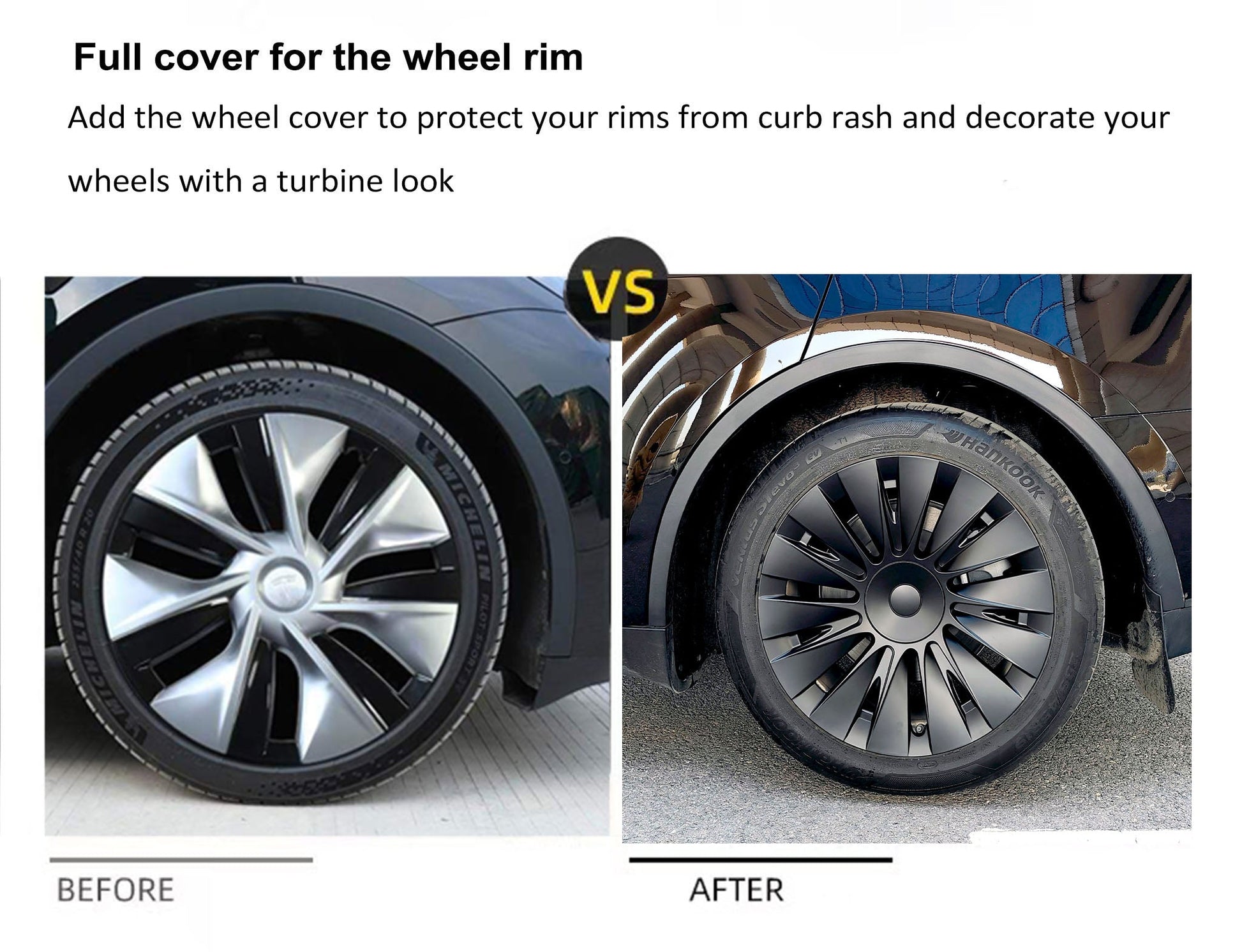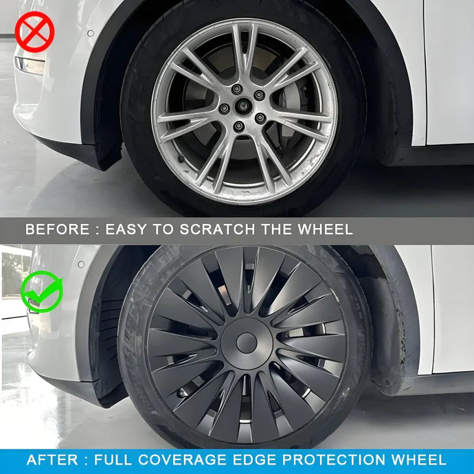 Adopt aerodynamic "14-Spokes" design, quickly change the look of your Model Y provide fully covered for all 4 wheels, extend to the tire and hide past curb rashes and protect wheels from scratches by kerb. Come with soft foam backing to protect the rims scratching by hubcaps when driving on a bumpy road.